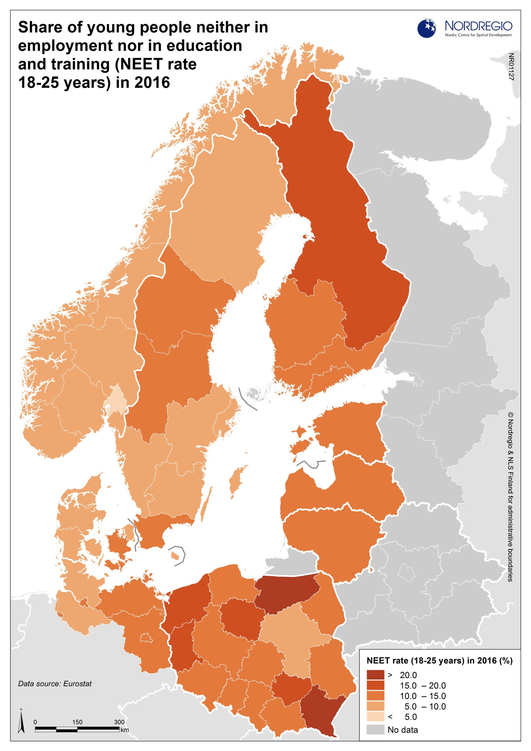 The map highlights two Polish regions, Podkarpackie and Warminsko-Mazurskie, as having the highest NEET rates in the BSR. High rates can also be found in several other Polish regions as well as the Northern and Eastern Finland Region. The lowest NEET rates in the Baltic Sea Region can be found in the Norwegian Capital Region, followed by several regions in Sweden, Norway and Denmark.