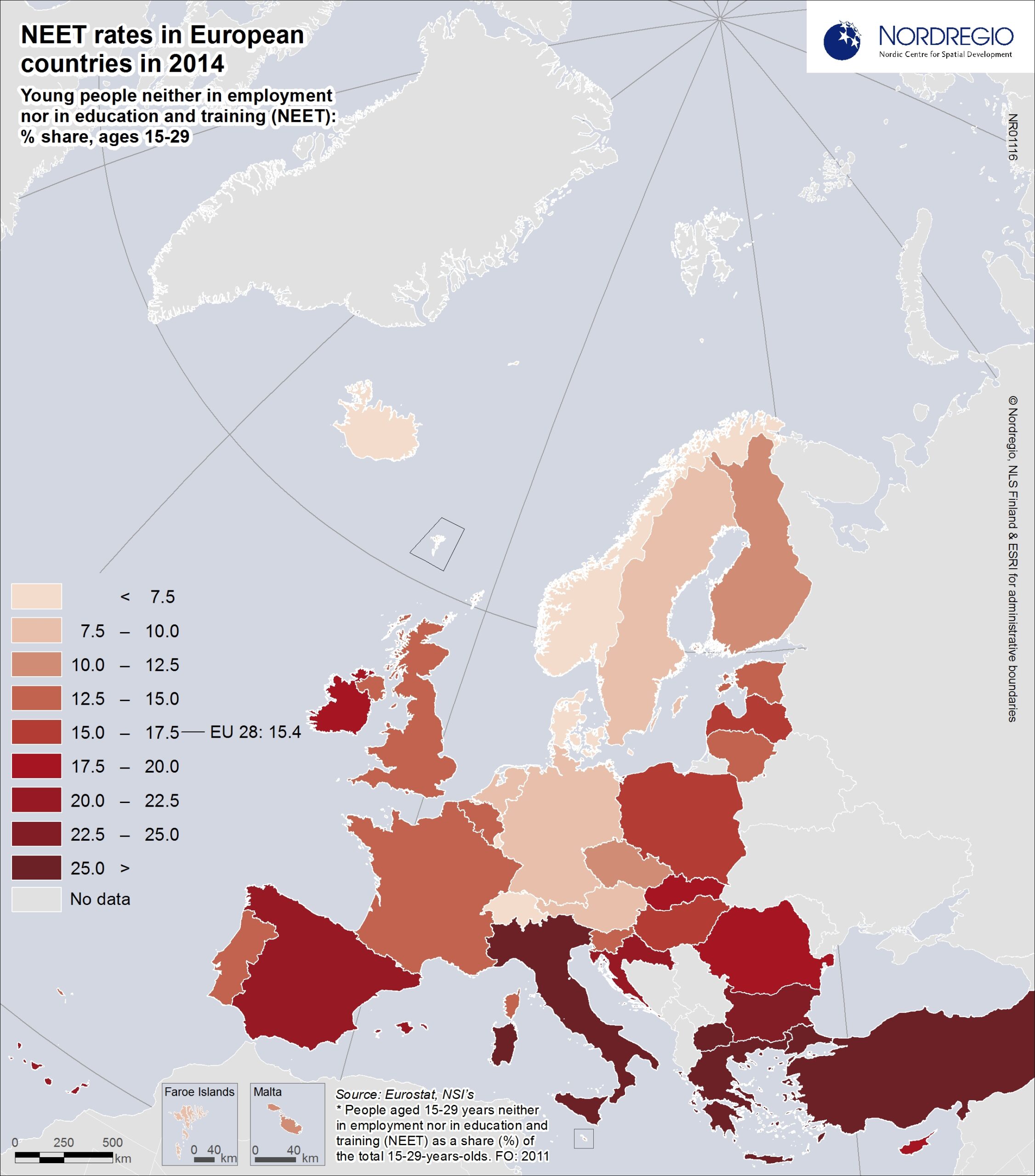 High rates of young people neither in employment nor education and training (NEET) are a growing concern in Europe as these figures represent young people’s exclusion from the labour market. In 2014, particularly high NEET rates were found in the Southern European countries of Italy, Macedonia, Greece, and Turkey. Europe’s lowest NEET rates were found in the Nordic countries (with the notable exception of Finland), Germany, the Netherlands, Luxembourg, Switzerland and Austria.