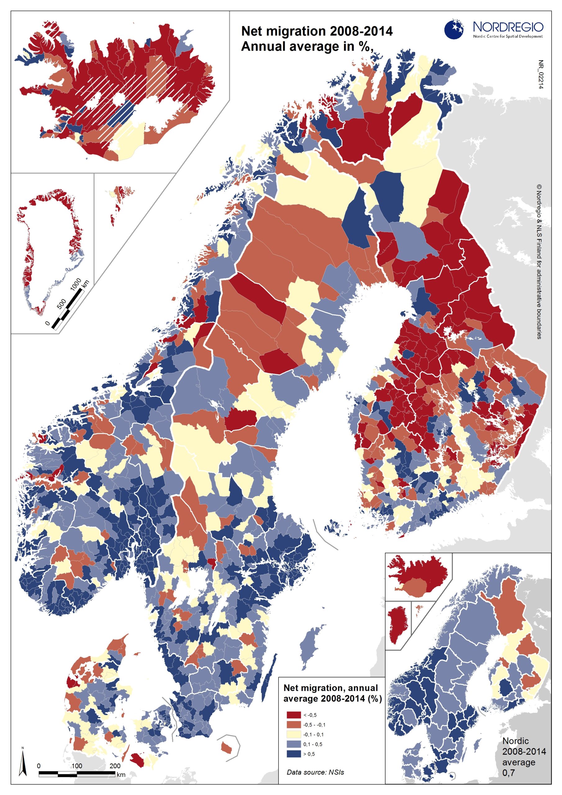 The Nordic region had an annual average net migration rate of 0.7% during the period 2008-2014. The map at the regional level indicates that all regions in Denmark, Norway and Sweden have net in-migration. The Faroe Islands, Greenland and Iceland highlights however have net out-migration. Most regions in the South-Western part of Finland have net in-migration, whereas the regions in the remaining parts of Finland suffer from net out-migration. At the municipal level, the municipalities with the largest settlements attract most of the migrants, whereas the most rural and sparsely populated parts of the Nordic region suffer from population decline. This observation applies in particular to municipalities in Denmark, Finland, Iceland and Sweden. In Norway, net in-migration not only occurs in the most urban municipalities but also in the majority of its rural municipalities. In the Faroe Islands and Greenland, where there is overall (national/regional) net out-migration, the municipal scale showcases their internal differences. The municipality containing Greenland’s largest settlement (Nuuk) shows a net in-migration flow.