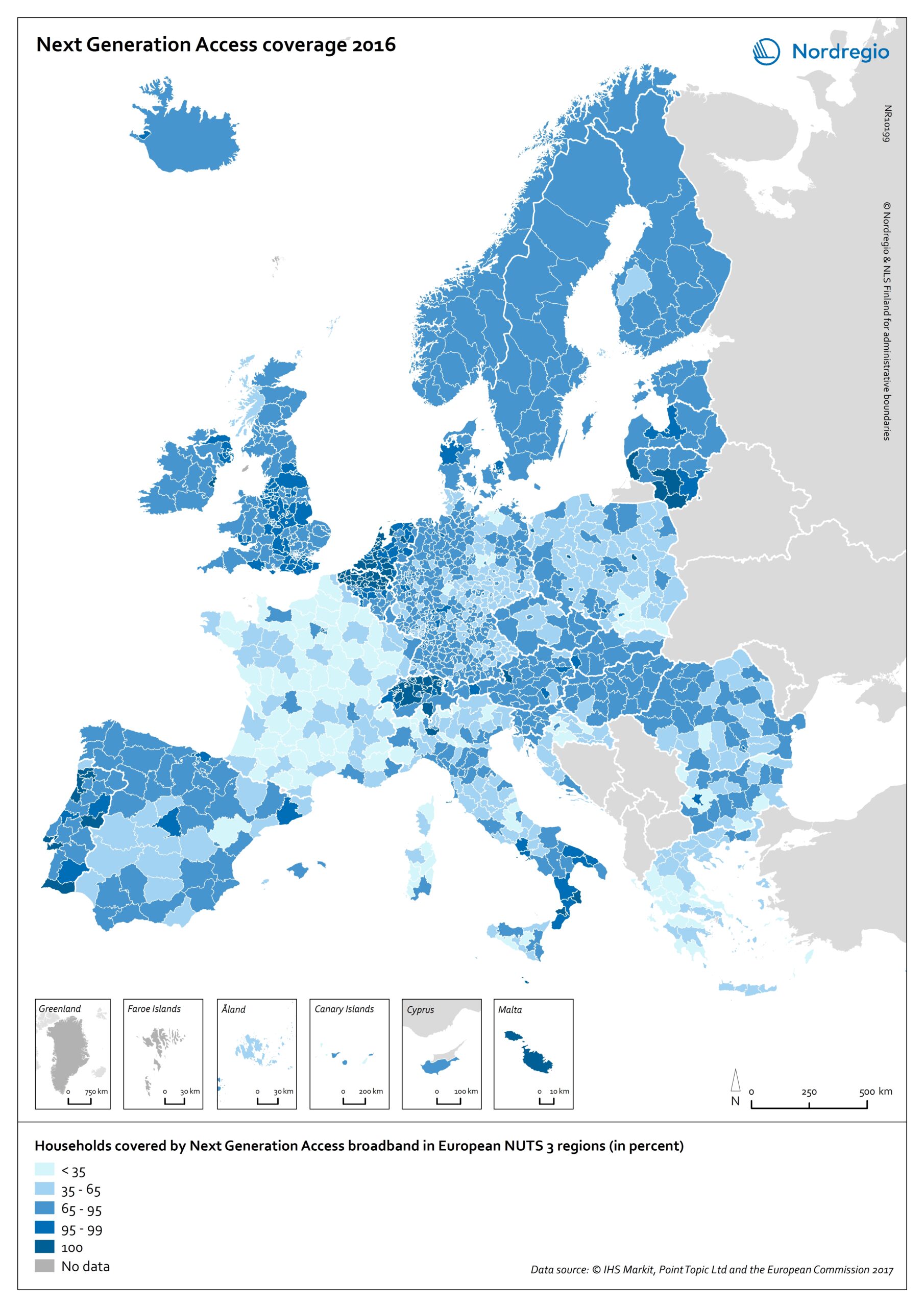 This map shows the Next Generation Access (NGA) network coverage in European regions in 2016.