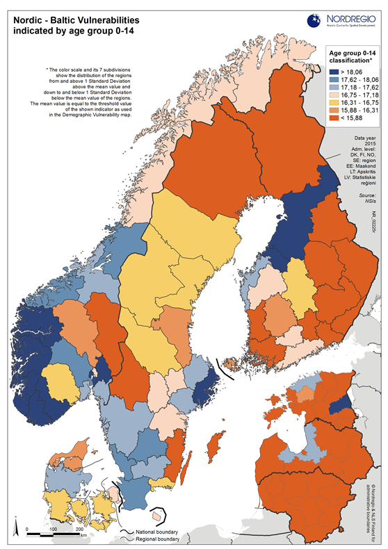This map shows demographic vulnerability in the Nordic-Baltic regions based on the indicator age group 0-14 years. Under this indicator, regions are deemed to be vulnerable when the percentage of the population aged 0-14 years is less than 16.09%. The majority of regions in Baltic countries and Eastern Finland have a share of population in this age group below this threshold. This suggests that, unless the low birth-rate is compensated for by other factors such as in-migration, the population of the Nordic-Baltic countries will drop. Regions with relatively large shares of the population aged 0-14 are the capital regions, the south-western part of Norway, and the middle-western part of Finland.