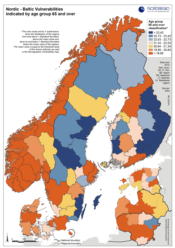 Age group 65 years and over is one of 10 indicators used to measure demographic vulnerability in the Nordic-Baltic Region. The map “Nordic-Baltic Demographic Vulnerabilities”, takes in all 10 indicators to provide an overall picture of demographic vulnerabilities at the regional level.