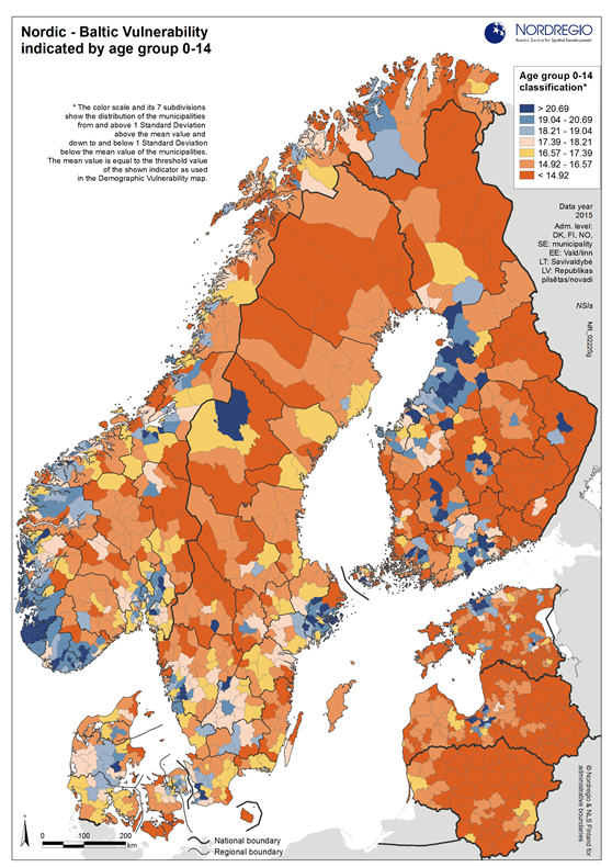 Age group 0-14 years is one of 10 indicators used to measure demographic vulnerability in the Nordic-Baltic Region. The map “Nordic-Baltic Demographic Vulnerabilities”, takes in all 10 indicators to provide an overall picture of demographic vulnerabilities at the municipal level.