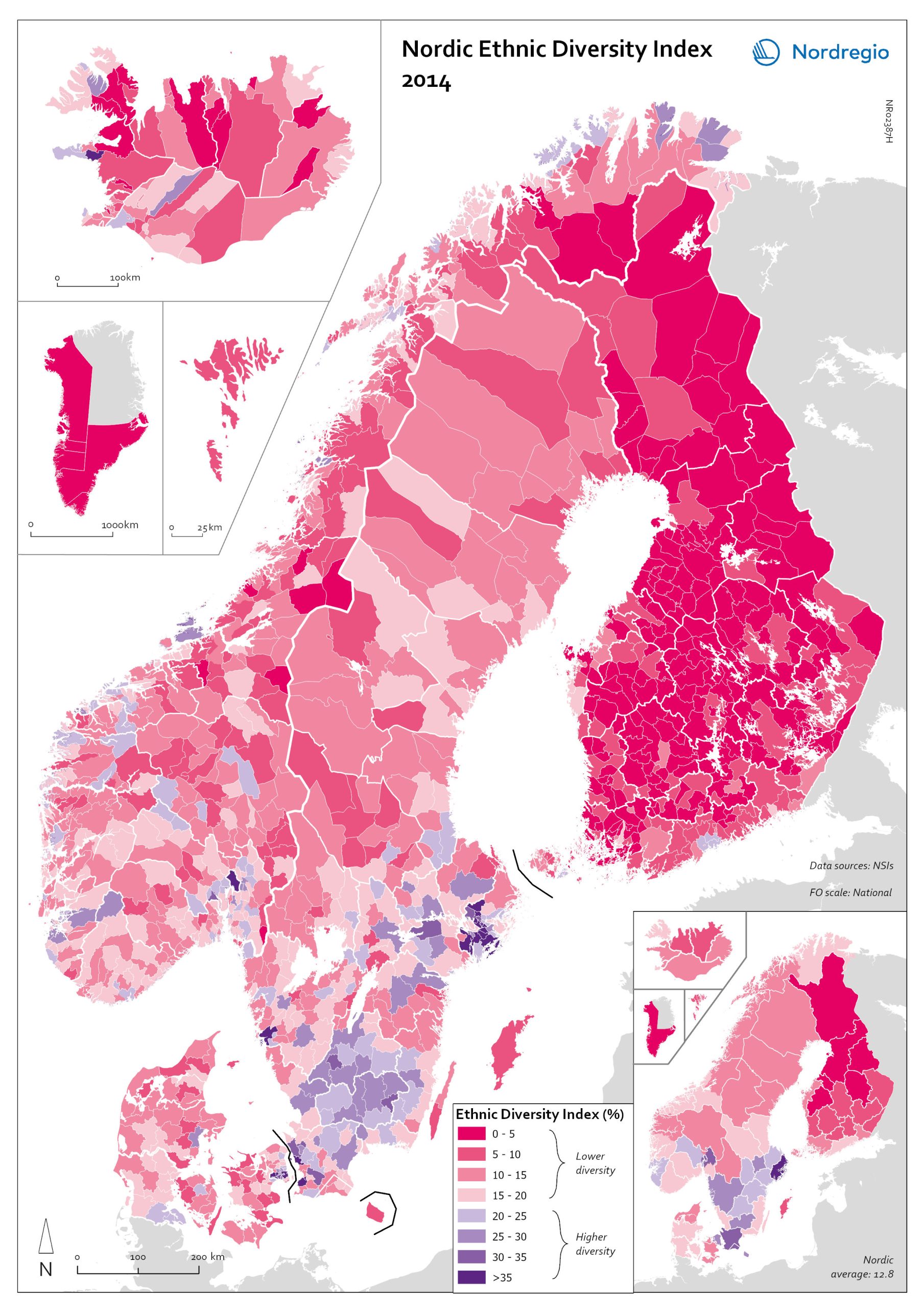 This map shows Nordic Ethnic Diversity Index by place of birth 2014.