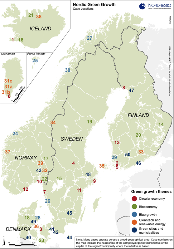 This map displays the location of the 50 case studies included in the report GREEN GROWTH IN NORDIC REGIONS 50 ways to make it happen. The legend indicates the green growth theme which each case study belongs to.