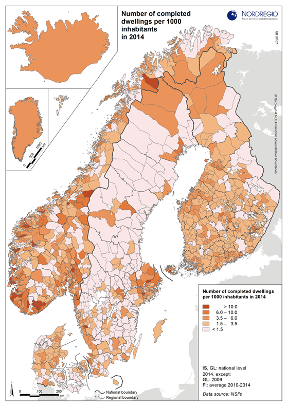 The map has two striking characteristics. Firstly, the low level of construction in Swedish municipalities outside of the urban regions or larger cities is apparent. Overall, new construction especially in Norway and Finland is in general higher and more spread out geographically. Secondly, construction is relatively lower in Denmark, and the Copenhagen region stands out in comparison to the other Nordic capital regions. It is also notable that large parts of the rather rural island of Åland have recently seen a high share of newly completed dwellings. The municipality of Jomala near Mariehamn stands out in particular, indicating that the capital region on this small island is currently growing. The data on this map can be interpreted overall as an indication of urbanisation and the enlargement of cities, since many of the municipalities with the largest construction per capita are those on the edges of urban regions or just next to larger cities.
