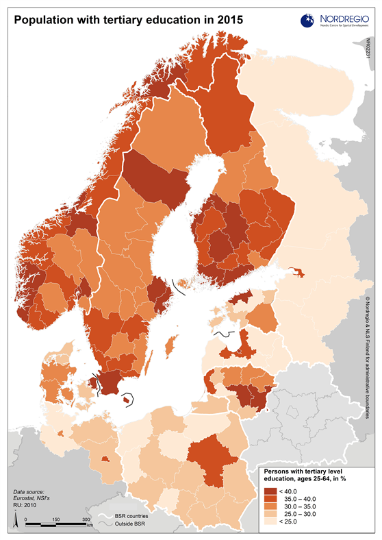 This map shows the number of persons aged 25-64 with tertiary education as a share of the total population in that same age group. Higher education opportunities in the BSR are, as elsewhere, concentrated in two types of places: 1) major metropolitan areas where the simple mass of population entails a supply of education services; and 2) the traditional “university town”. When examining the educational structure of the population in the BSR, both types of place are clearly discernible.