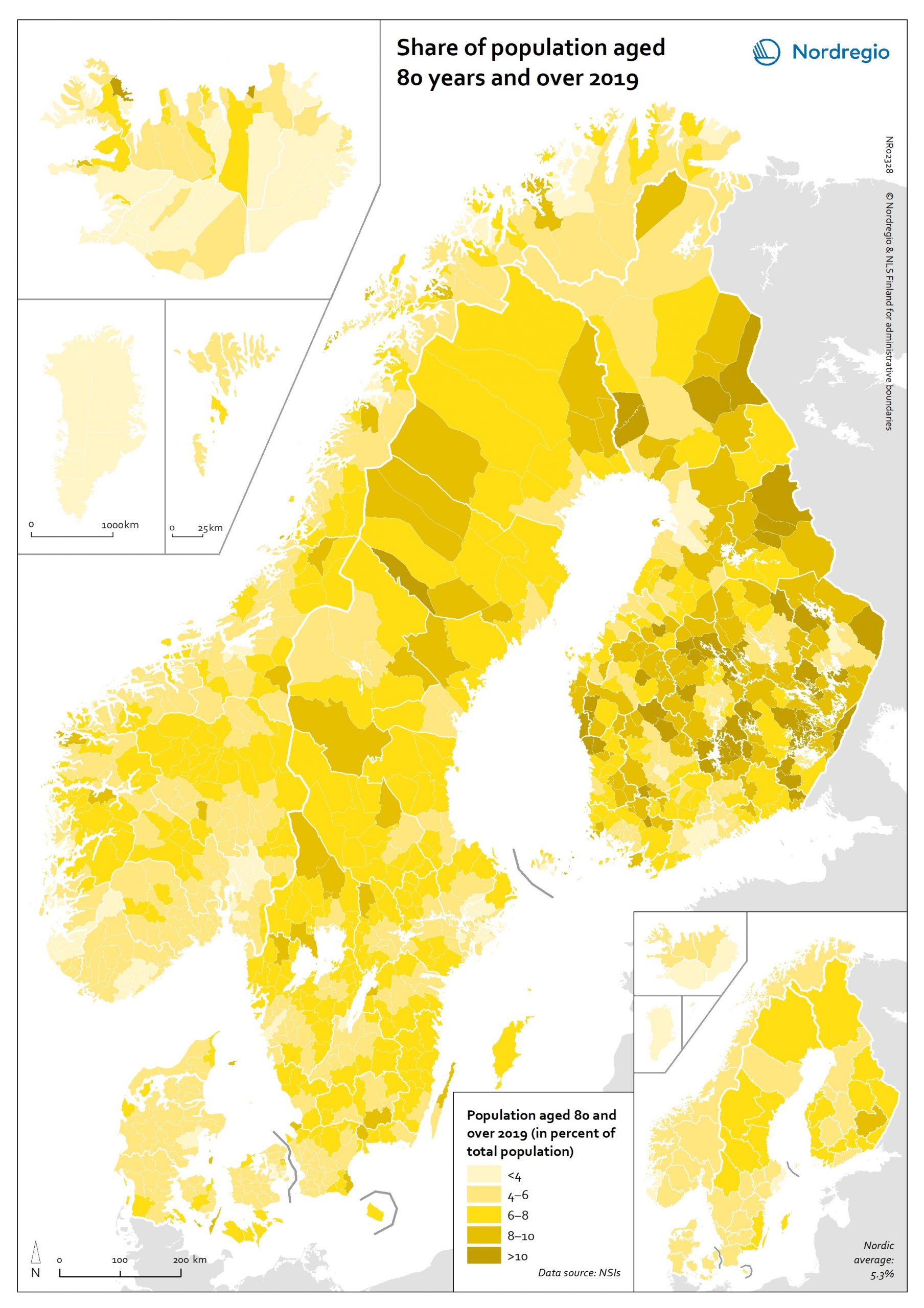 Greenlandic municipalities have a low proportion (between 0.6% and 1.5%), and there is also a low level of variation between the municipalities of the Faroe Islands (varying from 4.0% to 6.8%). When looking at the regional picture, within-country differences are evened out, particularly in Denmark, Norway, and Iceland. Across the Nordic Region as a whole, those municipalities having the highest proportions of elderly people within their populations follow the pattern of municipalities experiencing a decrease in population to a significant extent, except in Greenland.