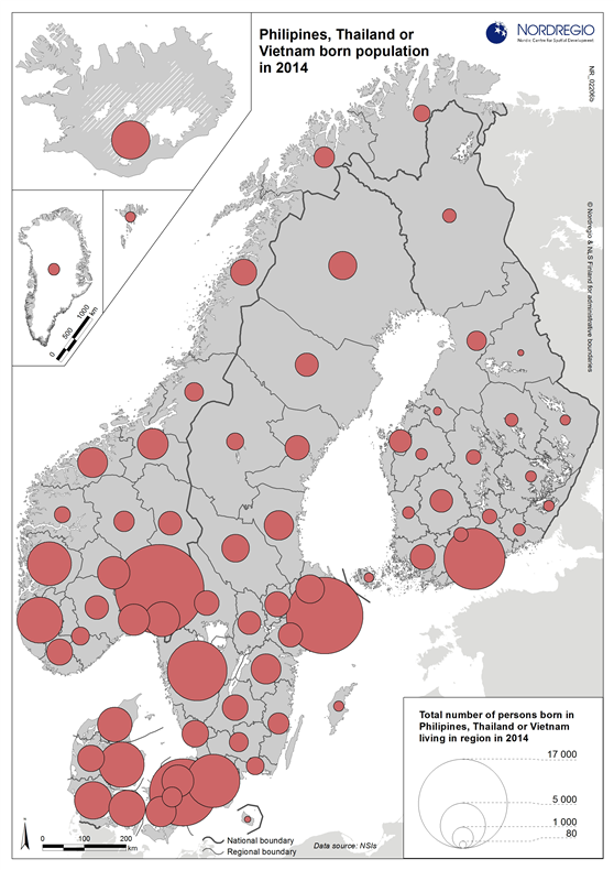 148 000 persons born in Philippines, Thailand or Vietnam are living in the Nordic Countries at the beginning of 2014. A majority of them are living in the capital regions, Oslo-Akershus and Stockholm regions being the most numerous destination.
