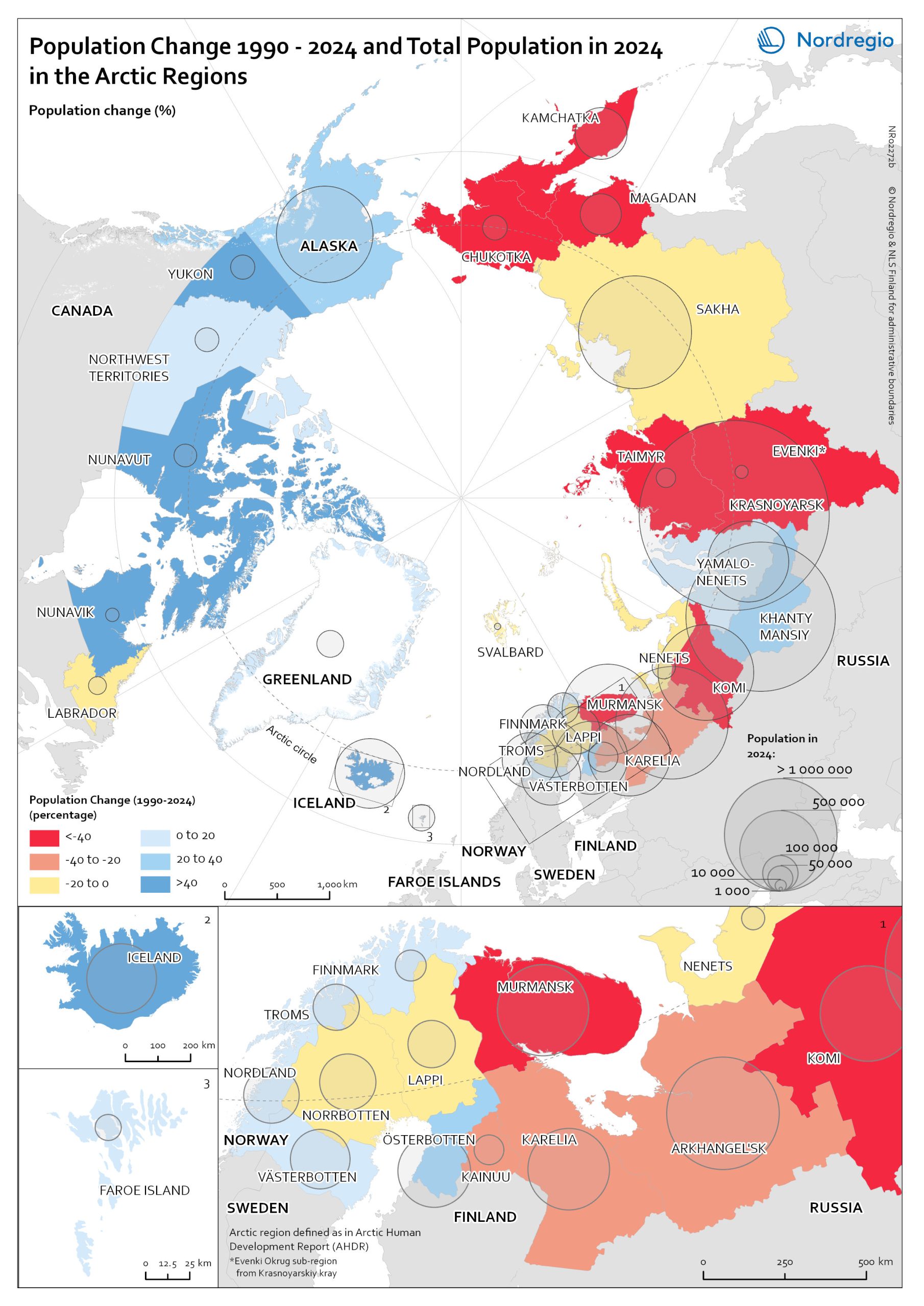 Population Change 1990-2024 and total population in 2024 in the Arctic Regions