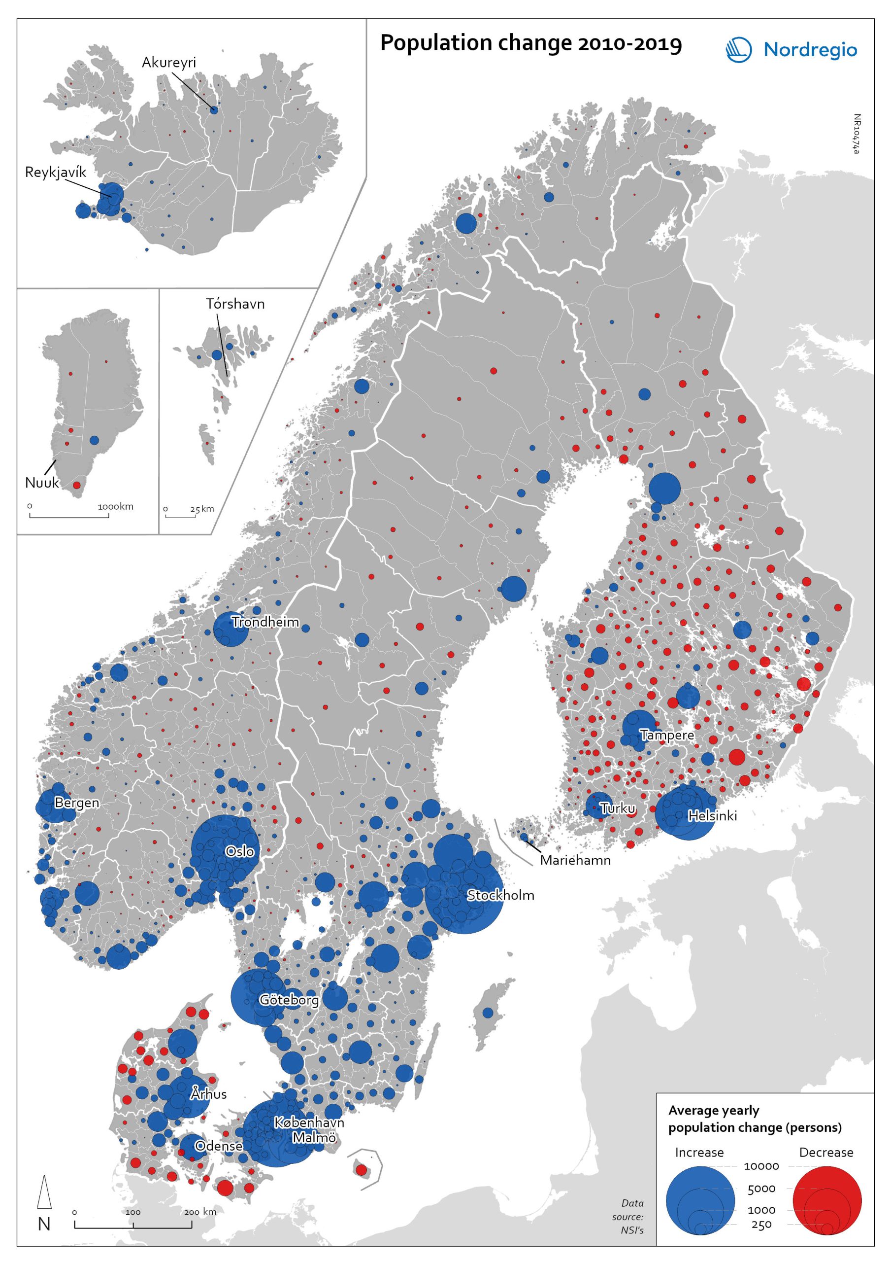 The map shows the type (positive or negative) and size of population change from 2010 to 2019 in all nordic municipalities.