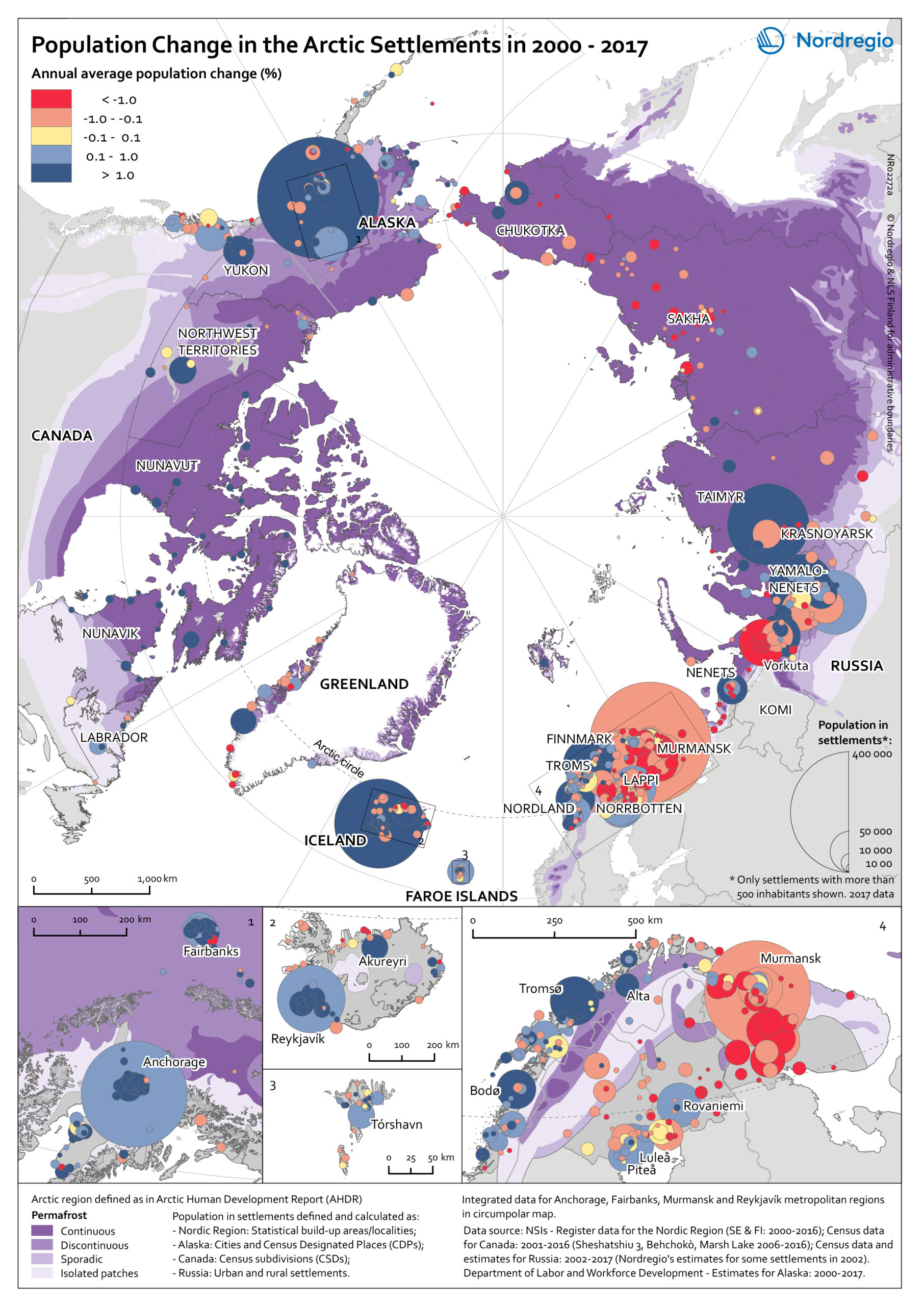 The map provides an overview of the population change in Arctic settlements with 500 inhabitants or more during the period 2000 to 2017.