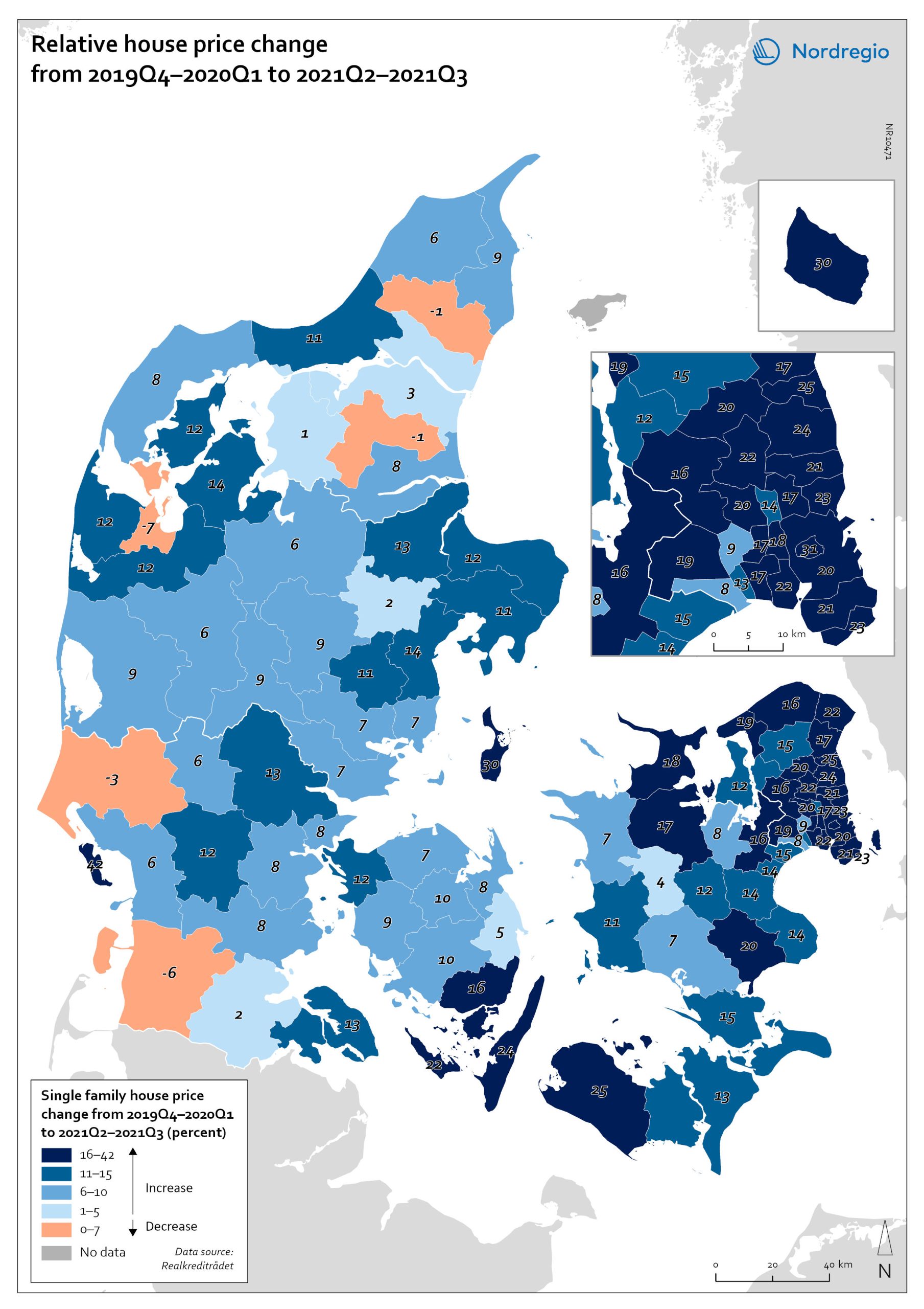The map shows the relative change in single-family house prices from fourth quarter 2019 and first quarter 2020 to second and third quarter of 2021 for Danish municipalities.