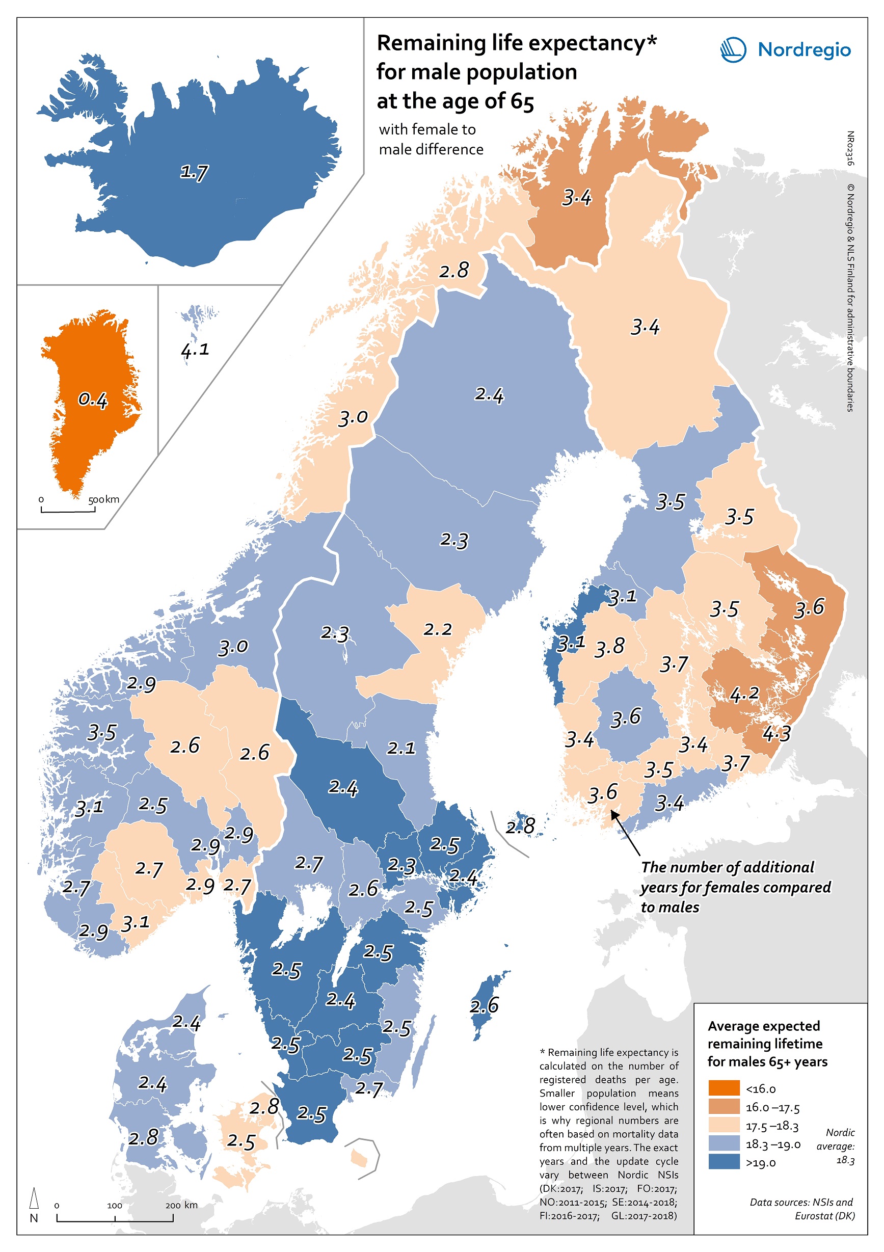 The Nordic average remaining lifetime for males at 65 is 18.3 years. Women are expected to live two to three years longer than men. The most obvious differences can be seen when comparing Iceland and Greenland. Iceland has the highest remaining life expectancy at 65, where men are expected to live for an additional 19.6 years on average compared to 21.3 years for women. Greenland stands out with clearly the lowest remaining life with 12.7 years for males and 13.1 years for women.