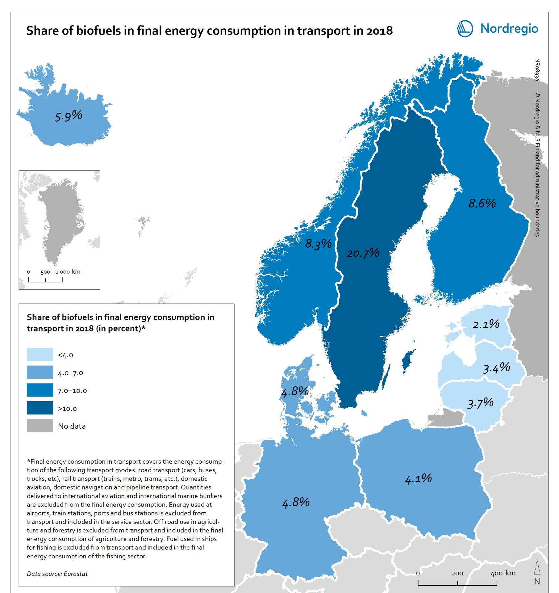 This map shows the share of biofuels in final energy consumption in transport in the Nordic Arctic and Baltic Sea Region in 2018.