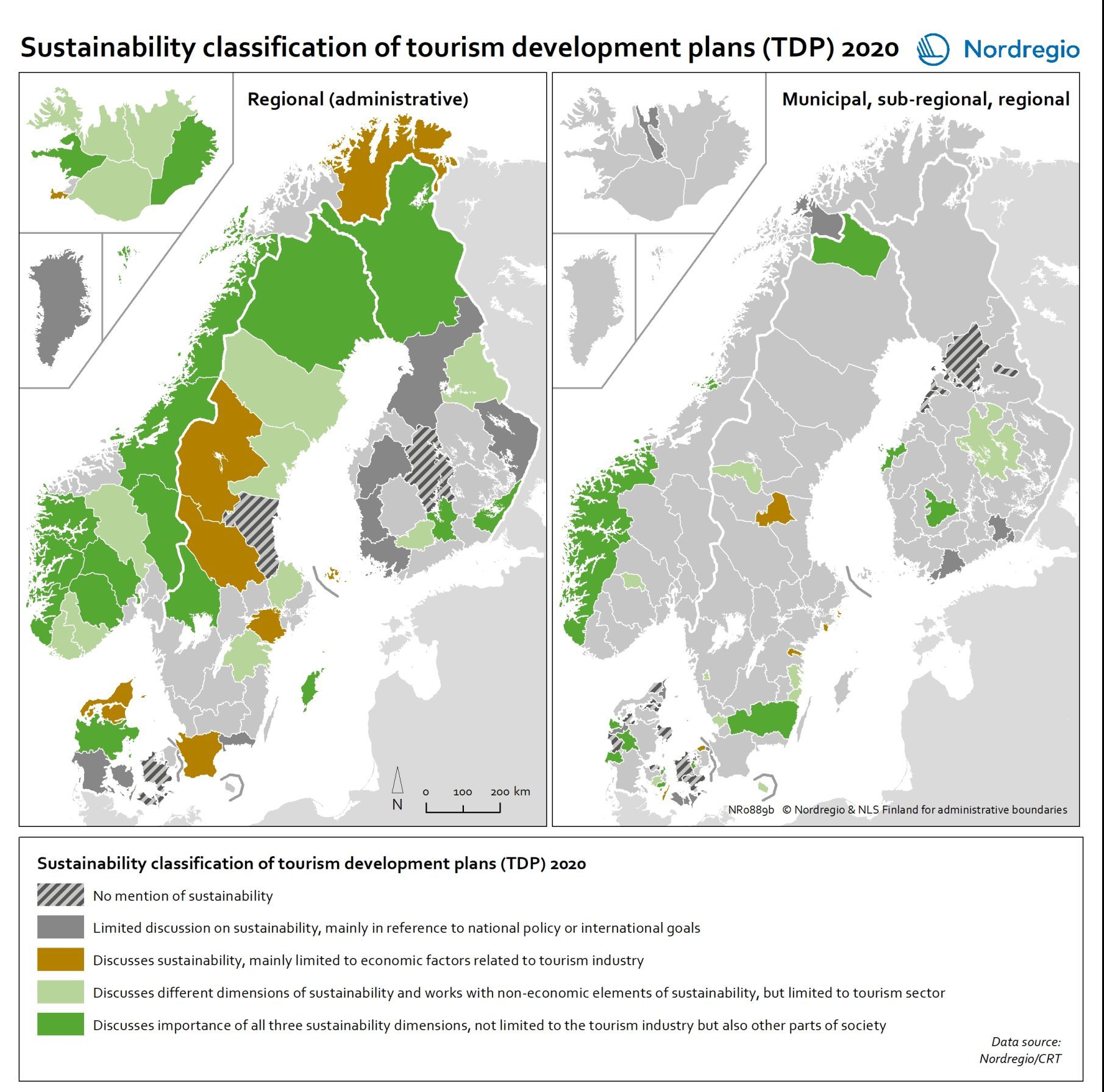 In this map, the dotted areas represent those TDPs that do not mention sustainability in any way. These mainly come from Denmark, as well as a few from Finland, Norway, and Sweden. The grey areas represent TDPs who mention the concept of sustainability, but in a very limited way, as a reference to an overall, global or international or national agenda, but without further operationalising or setting any goals regarding this for the local context. This type of treatment of sustainability concerns is mainly present in Finland, followed by Denmark and Sweden, plus a few cases from Norway and Iceland. Together, these two types represent almost two out of every five TDPs. They greyish green areas represent those TDPs which limit their discussion of sustainability to the economic sustainability of tourism businesses. This type of TDP is mainly found in Sweden, followed by Denmark, and then a case from each from Finland, Norway and Iceland.