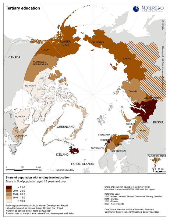 Map showing regional differences in the percentage of people in the Arctic with tertiary level education