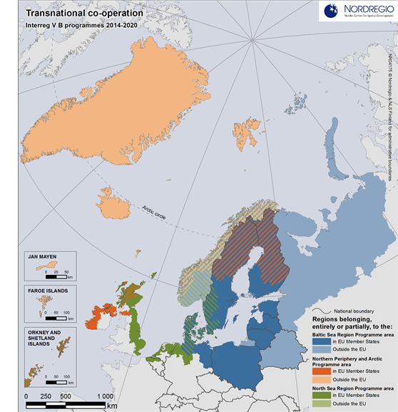 Transnational Cross-border Programmes in Northern Europe for the period 2014-2020 (Interreg V B). The map shows the geography of the cooperation regions and areas in the implementation of the programmes, i.e. North Sea Region, Baltic Sea Region, and Northern Periphery and Arctic Region.