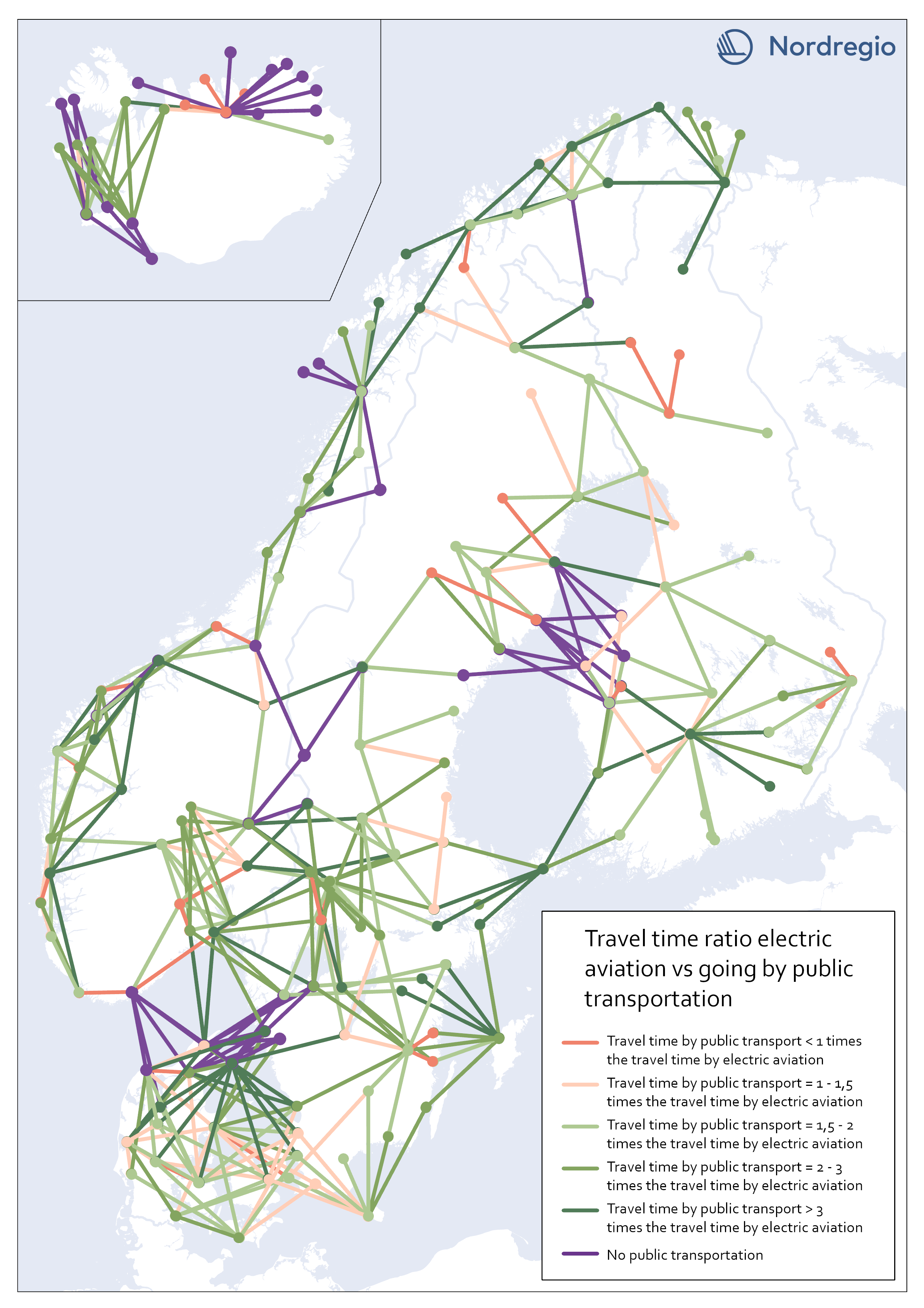 Routes represented by any nuance of green, are routes with significant travel time benefits for electric aviation in comparison with public transportation. The darker the nuance of green, the larger time benefit for electric aviation. The beige color represents routes where the travel time for public transportation is the same or up to 1,5 times the travel time for electric aviation. The red color represents routes where public transportation is faster than electric aviation. Purple lines represent routes where no public transportation is available. These were also routes where we could see significant time benefits for electric aviation.