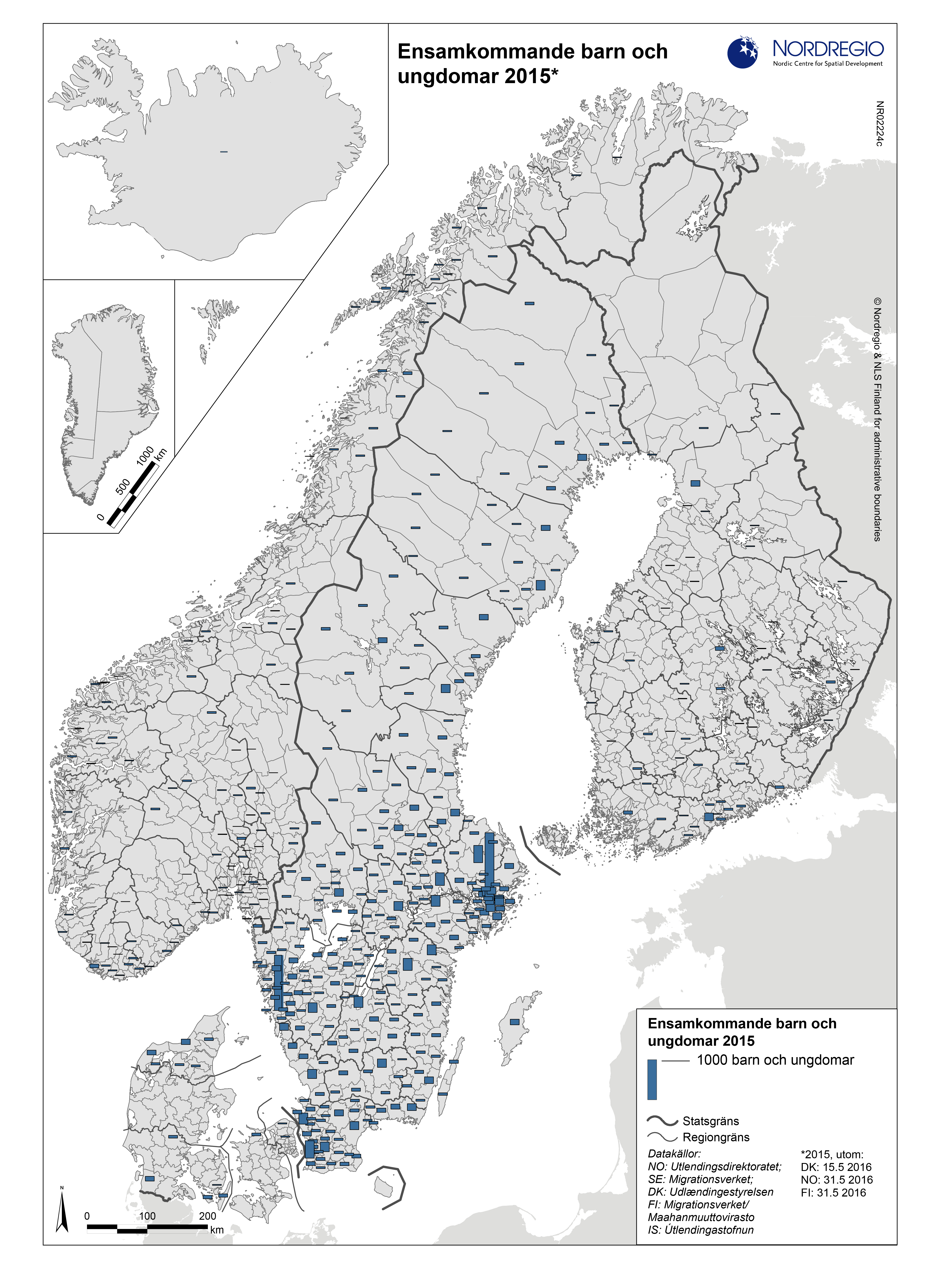 In 2015 more than 45000 unaccompanied minors sought asylum in the Nordic countries. This map shows the number of the unaccompanied minors on municipal level. The distribution of unaccompanied minors differs between the Nordic countries. In Sweden an agreement to receive unaccompanied minors signed by all the municipalities has resulted in them being distributed over the whole country. In Norway, Denmark and Finland unaccompanied minors are directed to accommodation centres resulting in higher concentrations in certain municipalities based on the location of these centres. Absolute numbers of unaccompanied minors arriving in the country were also substantially higher in Sweden.