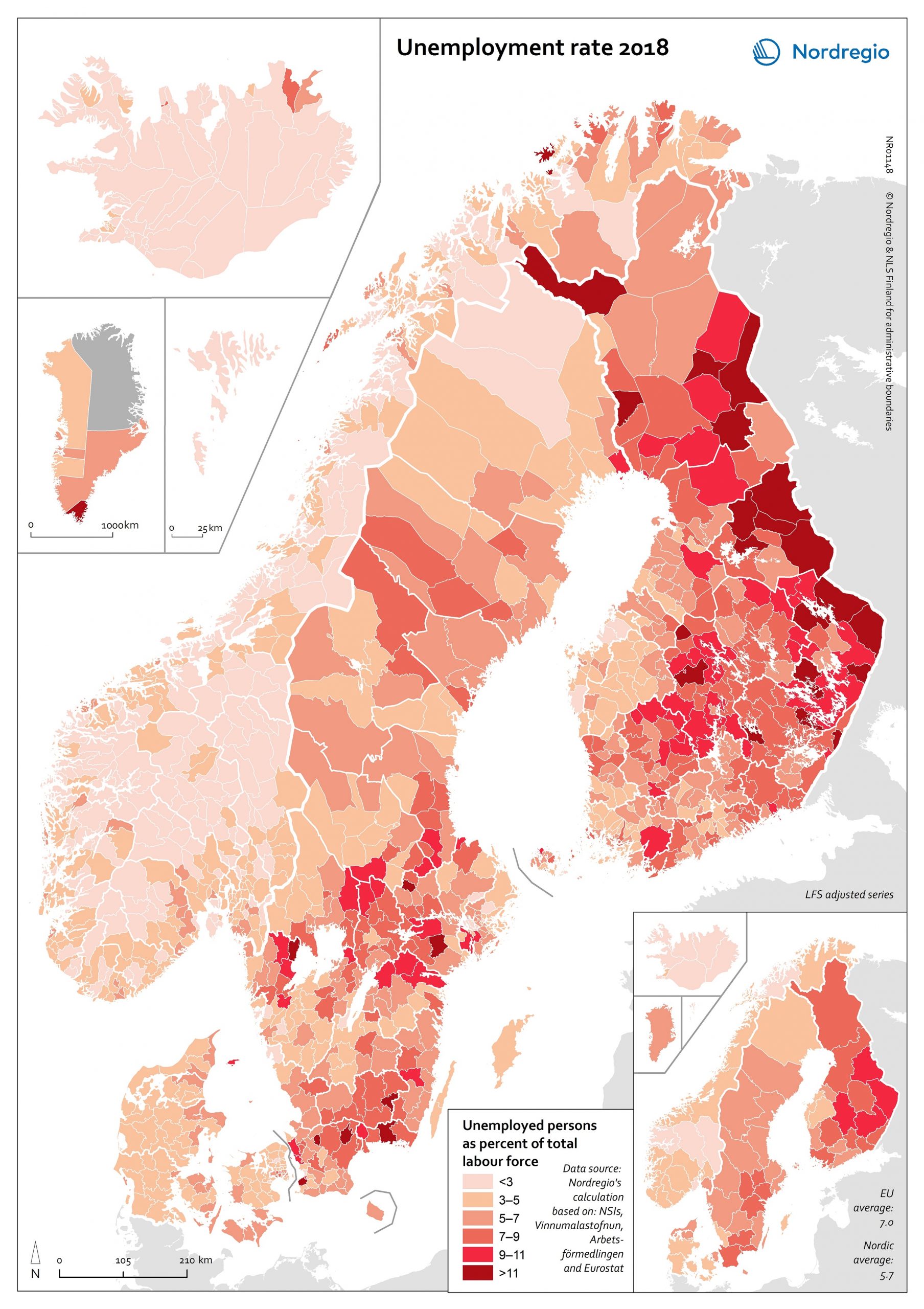 The map shows the unemployment rate in the Nordic counties at the municipal level in 2018.