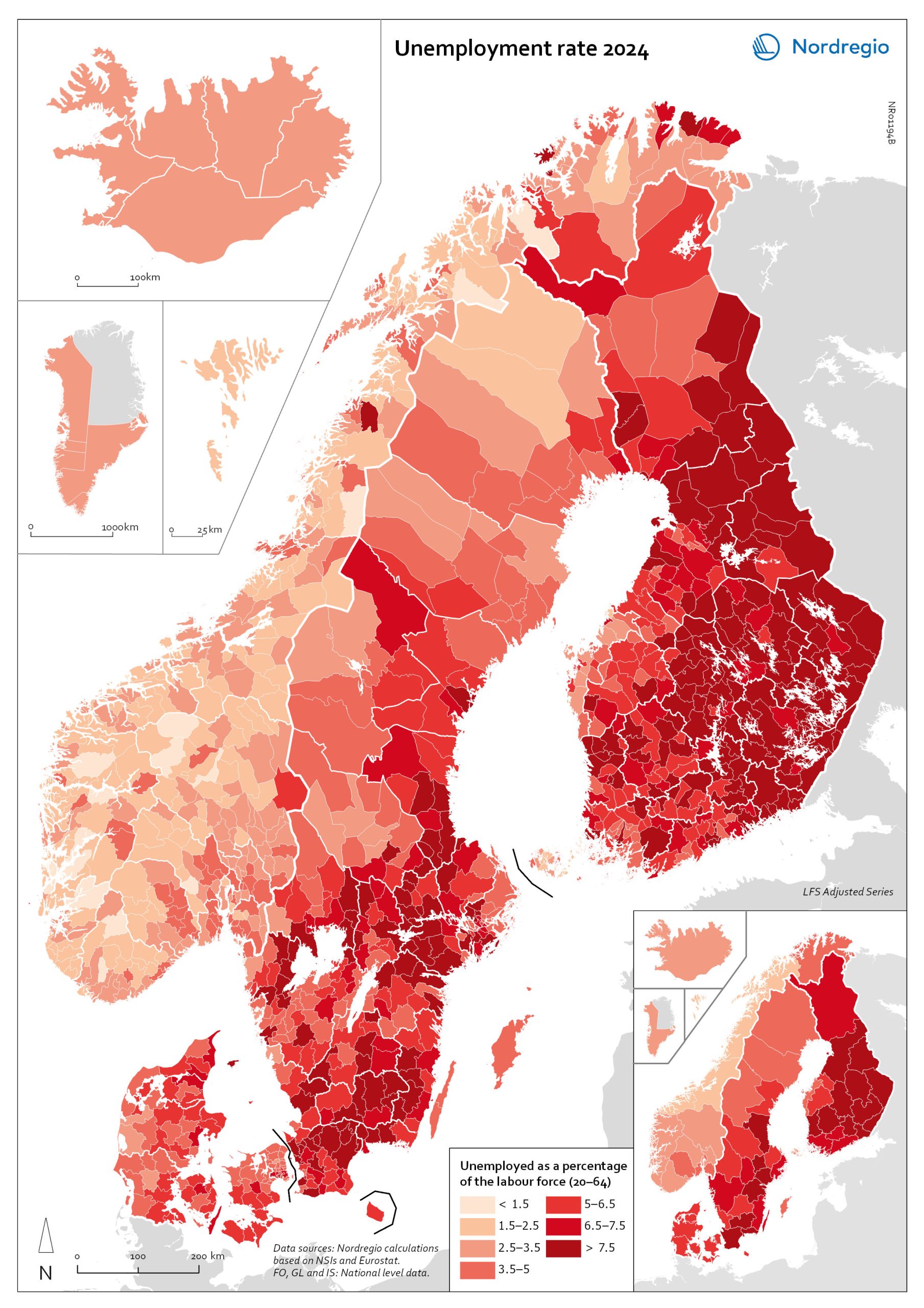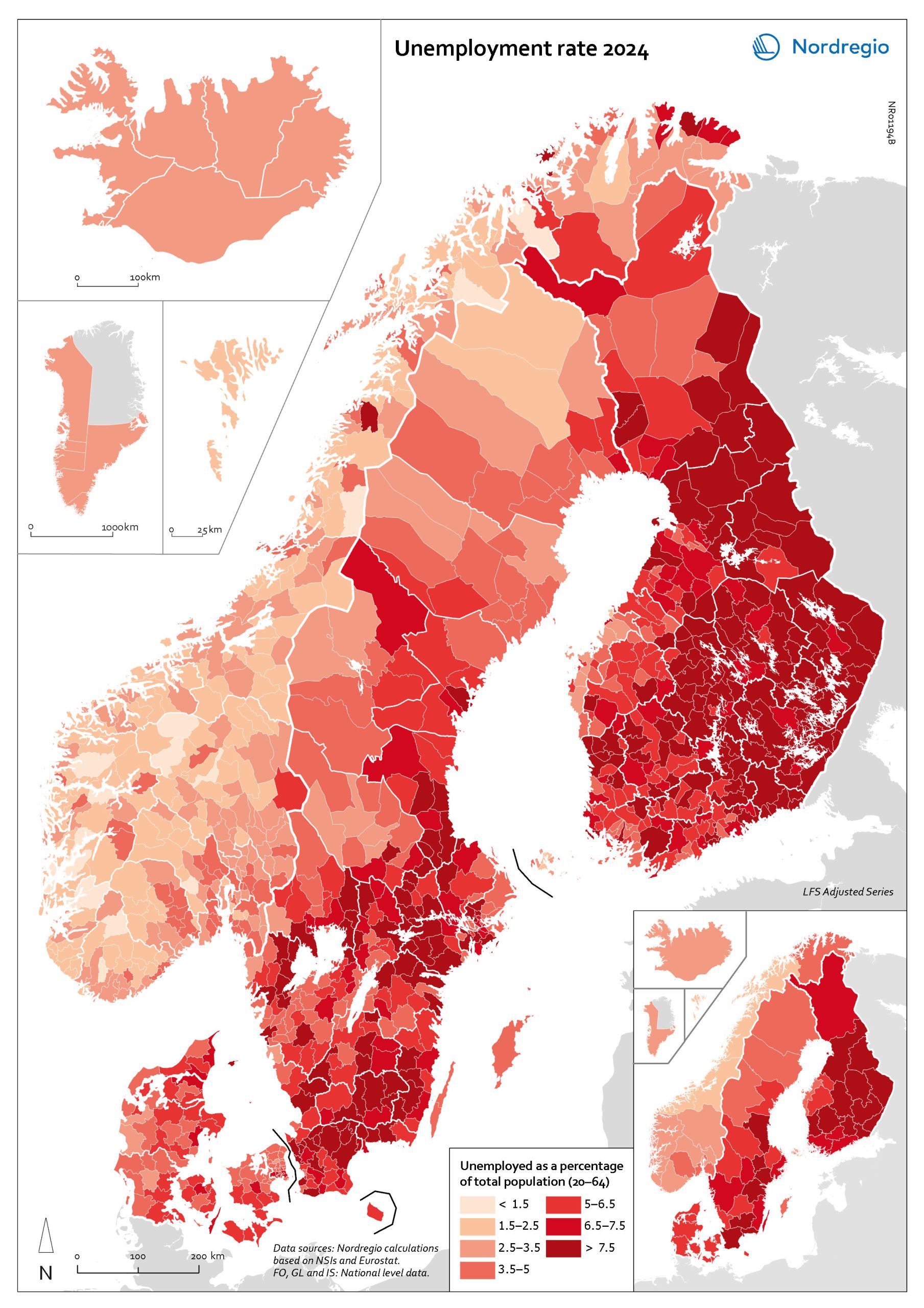 This map shows unemployment rates among 20-64–year-olds across the Nordic Region, 2024.