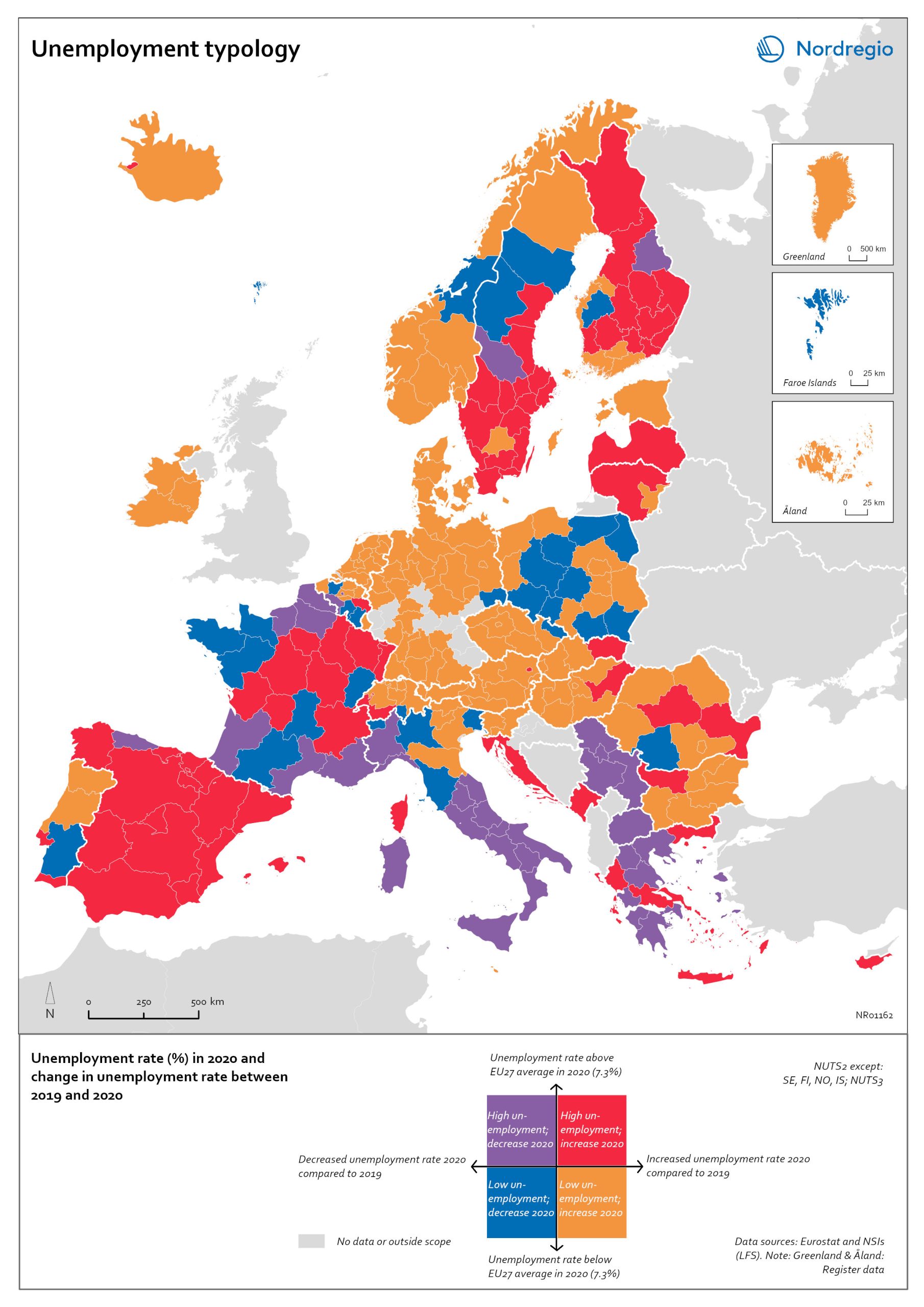 Regions falling into the second type, shown in orange on the map, had an increase in the unemployment rate in 2020 but a below-average unemployment rate in general in 2020. These regions had low pre-pandemic unemployment rates and so were not as badly affected as the red regions, despite the rising unemployment rates. They are located in Denmark, Iceland, Norway, Åland, southern and western Finland, Sweden (Gotland, Jönköping, and Norrbotten), Estonia, Ireland, northern Portugal and central and eastern parts of Europe.