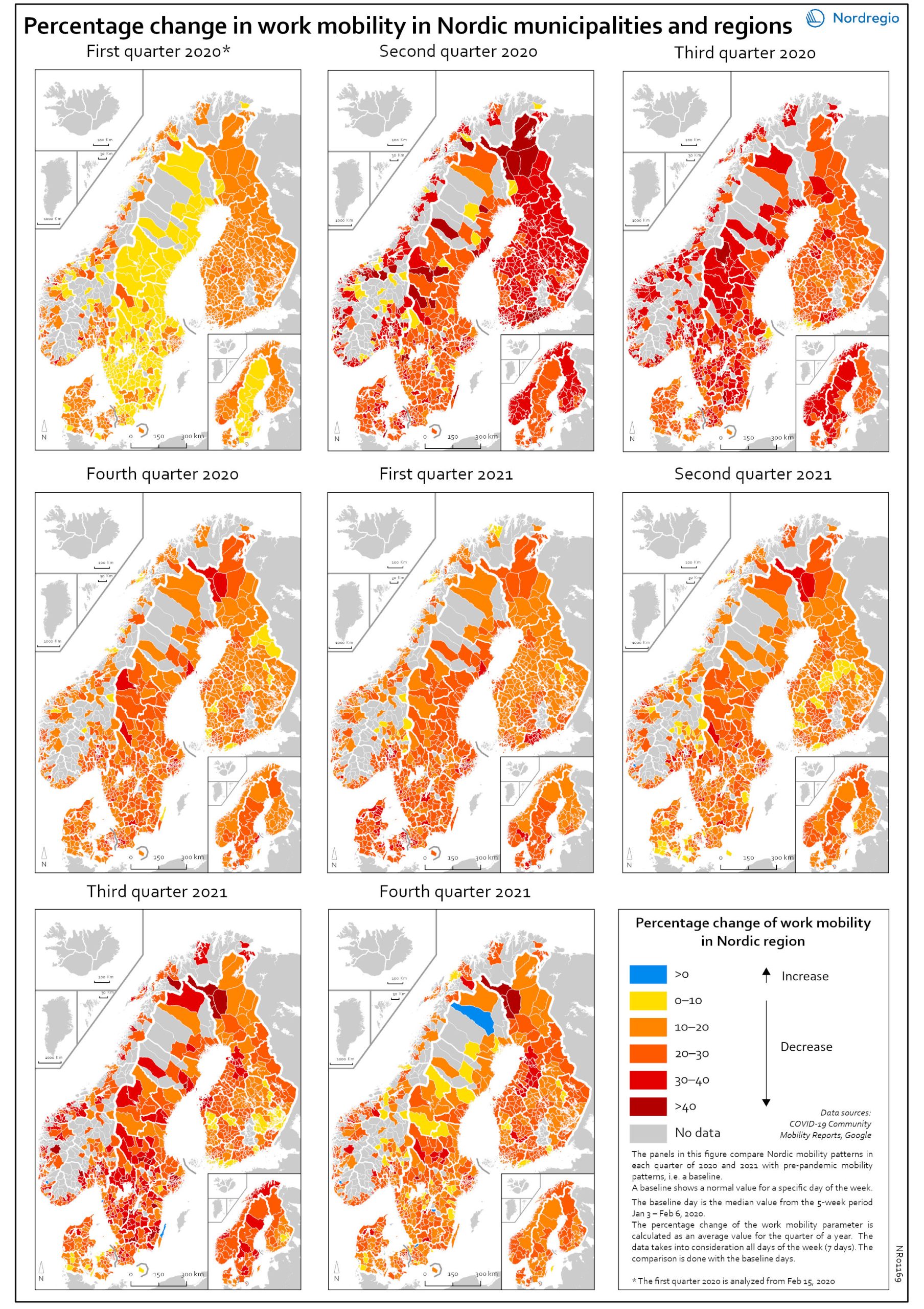 The map shows the percentage change for work mobility in Nordic regions and municipalities compared to a pre-pandemic baseline.