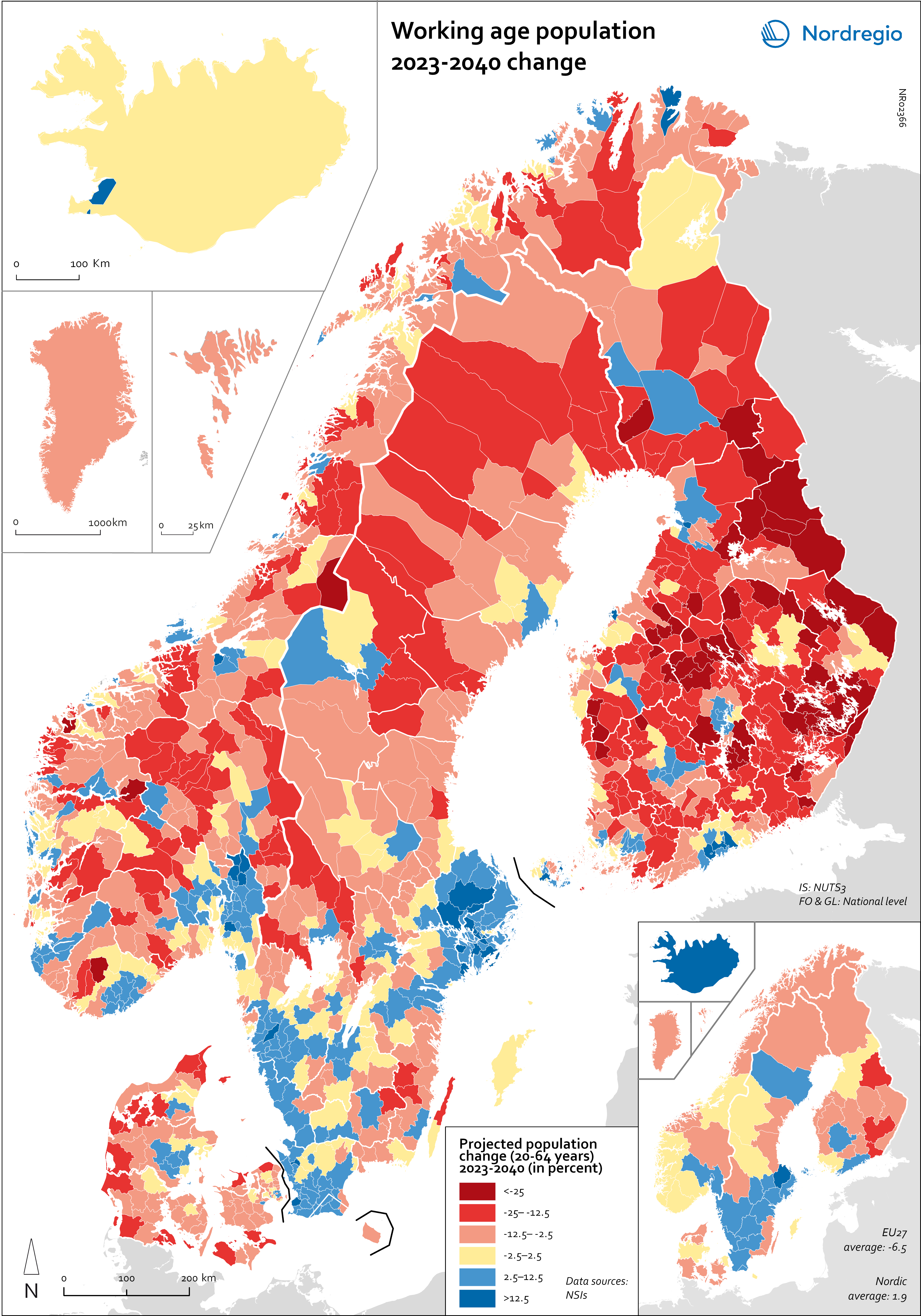 This map illustrates the projected change in the working-age population across Nordic municipalities (large map) and regions (small map) from 2023 to 2040. The working-age population is defined here as individuals aged 20 to 64. The blue areas on the maps represent municipalities and regions where the working-age population is expected to increase during this period. In contrast, the red areas indicate a projected decline in the working-age population. These projections are based on data from Nordic statistical institutes, though it’s important to note that the underlying assumptions may vary between Nordic countries.