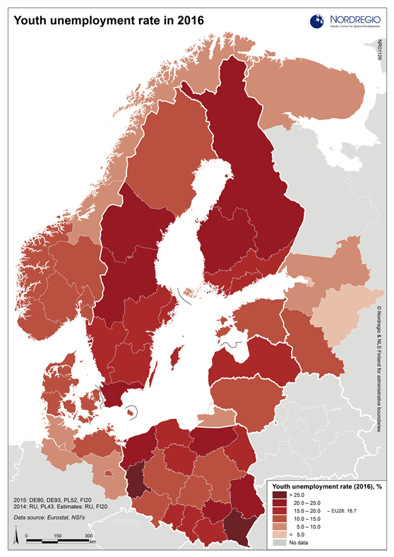 The map highlights two Polish regions, Podkarpackie and Lubuskie, as having the highest youth unemployment rates in the BSR. Several other regions in Poland, along with regions in Northern Finland, Central Sweden and the southernmost Swedish region of Skåne, have also been rather severely hit by youth unemployment. The lowest youth unemployment rates can be found in several Russian regions, among them St. Petersburg, and in regions in Northern Germany and Northern Norway.
