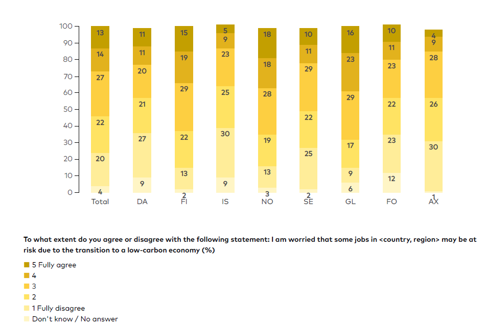 Norlén also presented some key results from Nordregio’s survey report “In all fairness: perceptions of climate policies and the green transition in the Nordic Region“, released earlier this year, of the attitudes towards climate change and climate change mitigation among the Nordic Region’s inhabitants. The survey revealed that Norway, Greenland, and Finland are more worried about potential job losses due to the green transition, compared to the Nordics at large, and that 31% of the whole region believes in the creation of new jobs, following the transition.