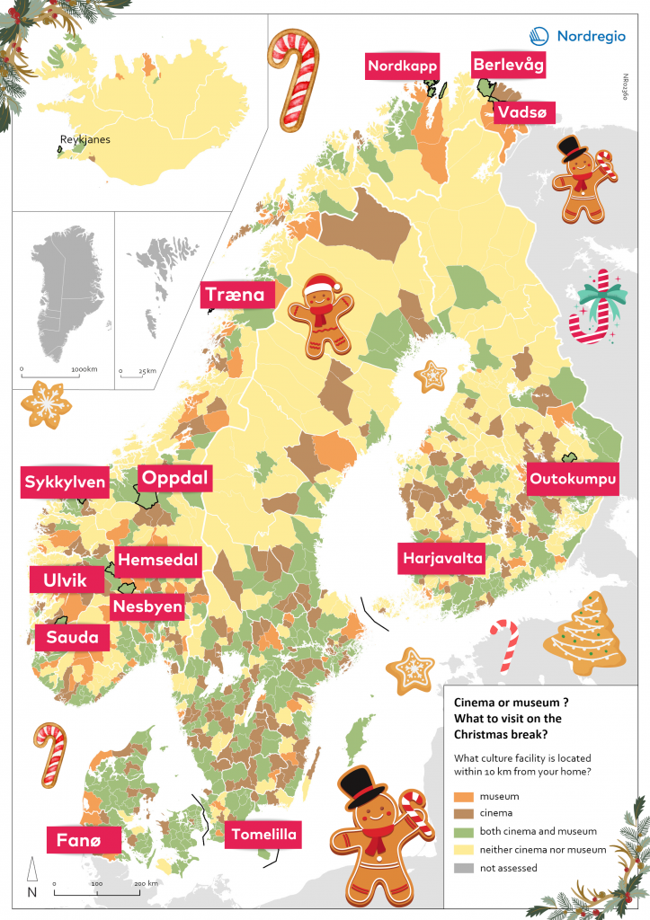 After several years of Covid restrictions with not much to do, we are eager to go out and about to experience some culture during the Christmas holiday. Nordregio has ranked the Nordic municipalities according to their accessibility to culture – in this case, a cinema or a museum. The map shows where the population, on average, has under 10 km to a cinema or a museum. This is considered to be “good” according to Nordic standards.