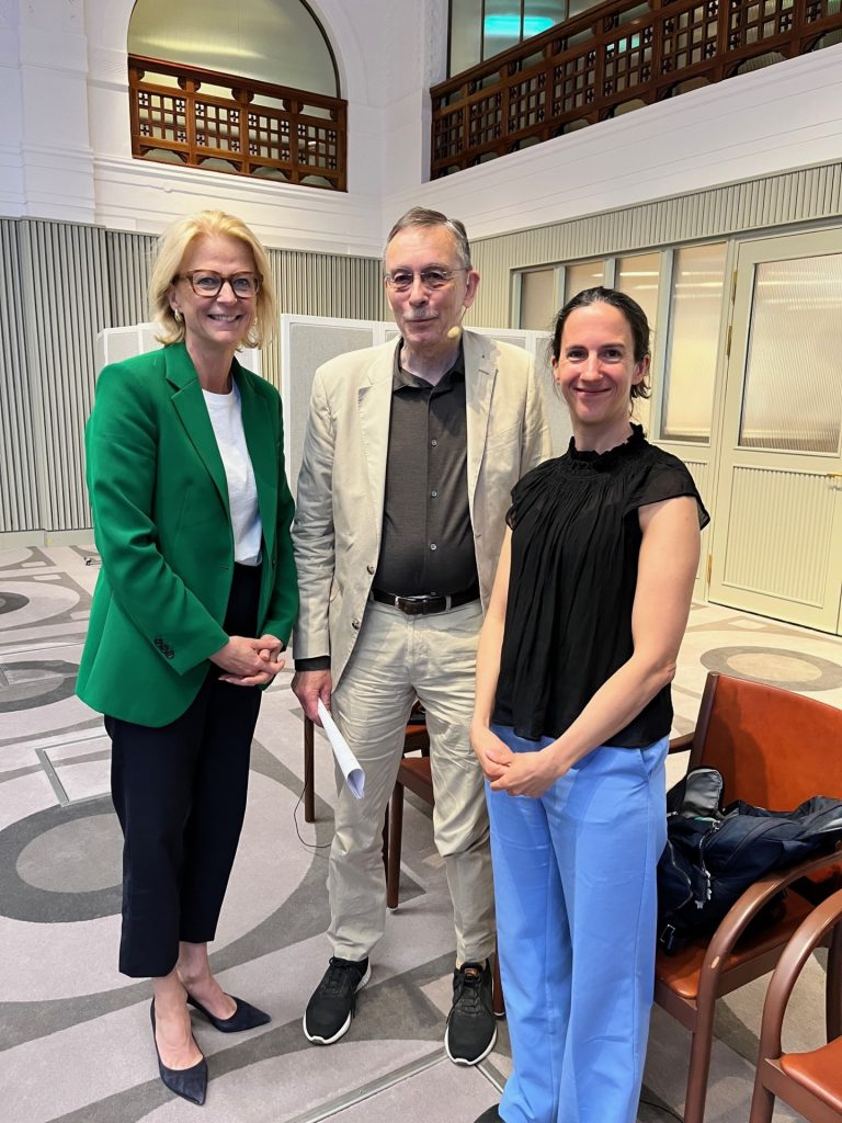 Elisabeth Svantesson, Swedish Minister of Finance, photographed with report authors Lars Calmfors, Professor Emeritus of International Economics at Stockholm University, and Nora Sanchez Gássen, Senior Research Fellow at Nordregio