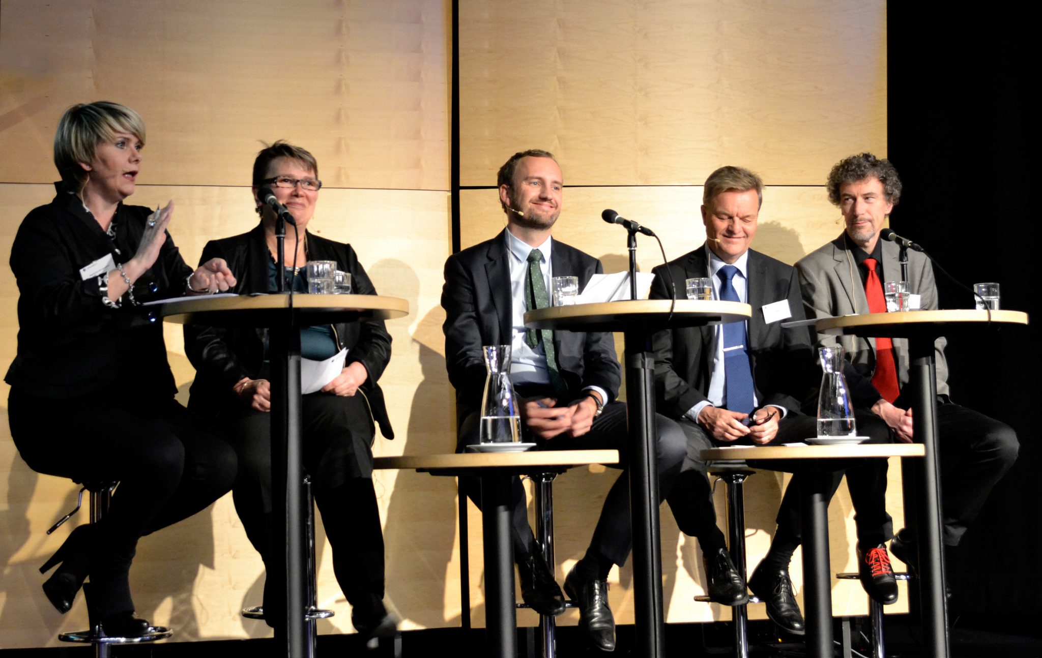 The members of the panel (left to right): Ragnheiður Elín Árnadóttir, Minister of Industry and Commerce in Iceland, Kaisu Annala, Strategic Director at the Ministry of Employment and the Economy, Finland, Christian Lützen from the Ministry of Housing, Urban and Rural Affairs, Denmark, Hallgeir Aalbu, Director General at the Ministry of Local Government and Modernisation, Norway and Sverker Lindblad, Senior Senior Adviser at the Division for Regional Growth at the Swedish Ministry of Enterprise, Energy and Communications, Sweden.