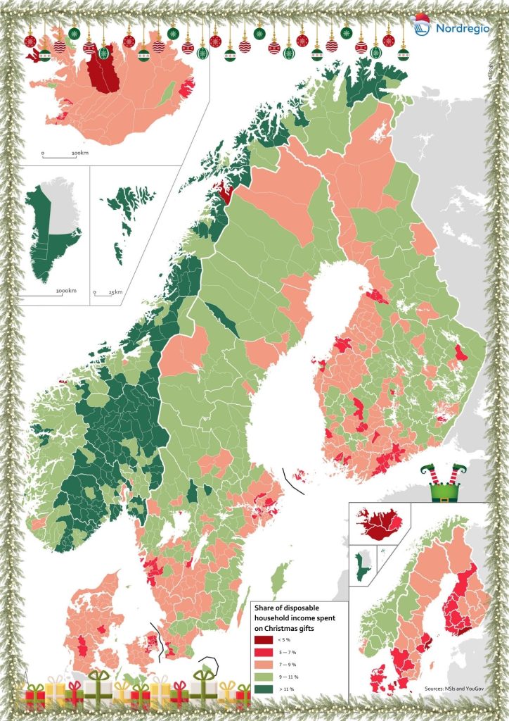 By using national statistics from each country’s statistical office, Nordregio visualises how much Nordic households spend on Christmas gifts, measured as a percentage of average monthly disposable income.