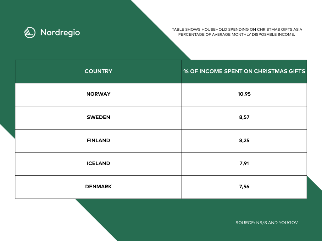 Norway spends the most on Christmas gifts out of all the Nordic countries, both in absolute numbers and in terms of disposable income. 10.95 percent of a Norwegians disposable income in December are spent on Christmas gifts.