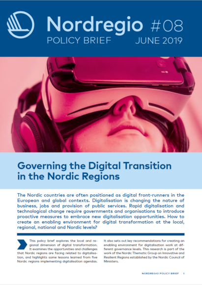This policy brief explores the local and regional dimension of digital transformation. It examines the opportunities and challenges that Nordic regions are facing related to digitalisation, and highlights some lessons learned from five Nordic regions implementing digitalisation agendas. It also sets out key recommendations for creating an enabling environment for digitalisation work at different governance levels.