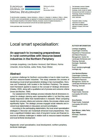According to the participating stakeholders, the local smart specialisation strategies in Storuman and Sodankylä enhanced local preparedness. However, a significant limitation was a lack of long-term human and financial resources to address challenges in relation both to resource-based industries and local, territorial development.