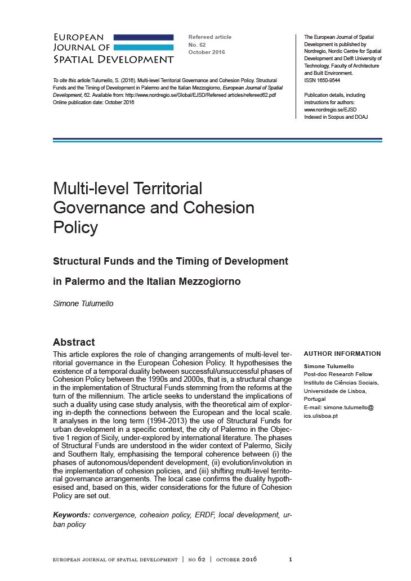 Multi-level Territorial Governance and Cohesion Policy: Structural Funds and the Timing of Development in Palermo and the Italian Mezzogiorno