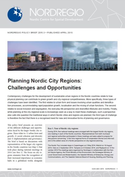 The first relates to urban form and issues involving urban qualities and densification processes, accommodating rapid population growth, localisation and the mixing of urban functions. The second relates to social inclusion and segregation, the everyday life perspective and diversified lifestyles and mobility. Finally, while planning at the city-regional scale is increasingly seen as a way to meet these challenges, such a perspective also calls into question the traditional ways in which Nordic cities and regions are planned; the third type of challenge is therefore the fact that there is a recognised need for new and innovative forms of planning and governance.