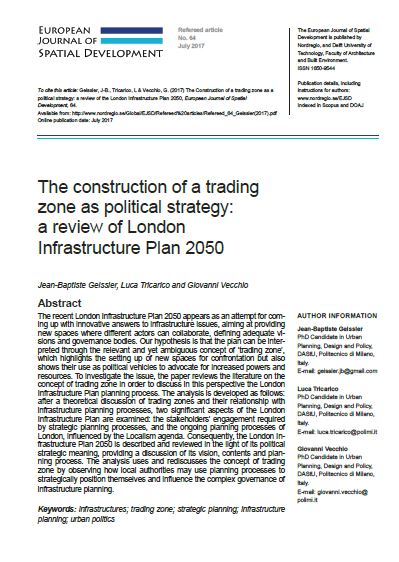 Our hypothesis is that the plan can be interpreted through the relevant and yet ambiguous concept of ‘trading zone’, which highlights the setting up of new spaces for confrontation but also shows their use as political vehicles to advocate for increased powers and resources. To investigate the issue, the paper reviews the literature on the concept of trading zone in order to discuss in this perspective the London Infrastructure Plan planning process. The analysis is developed as follows: after a theoretical discussion of trading zones and their relationship with infrastructure planning processes, two significant aspects of the London Infrastructure Plan are examined: the stakeholders’ engagement required by strategic planning processes, and the ongoing planning processes of London, influenced by the Localism agenda. Consequently, the London Infrastructure Plan 2050 is described and reviewed in the light of its political strategic meaning, providing a discussion of its vision, contents and planning process. The analysis uses and rediscusses the concept of trading zone by observing how local authorities may use planning processes to strategically position themselves and influence the complex governance of infrastructure planning.