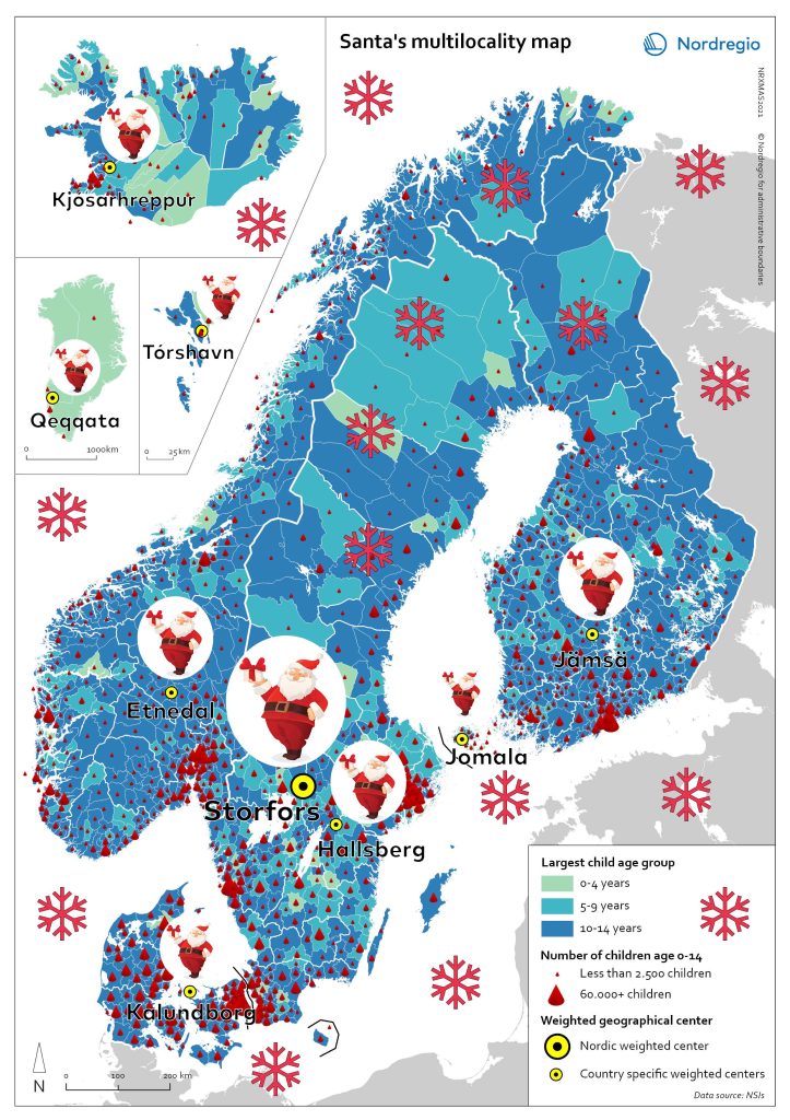 If Santa is to serve all children (0-14 years old) throughout the Nordic Region from a single address, the solution lies in Storfors Municipality. WHERE? – you might think. It is a real place, in Central-Southern Sweden. Here Santa has an average distance of 425 km distance to each child from his own backyard. This still sounds like awfully many kilometers. Could he be even more multilocal – with a home in each of the Nordic countries? This would help him to reduce his overall commuting to work significantly.